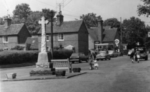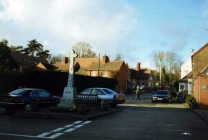 A postcard showing the War Memorial, Church View Cottage, and the site of Central Stores.