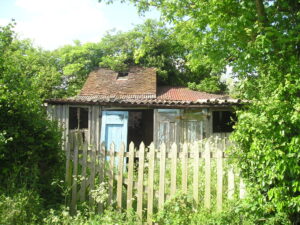 Photograph showing a small, brick building in the field behind the Old Thatch, 2008.