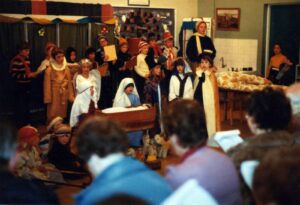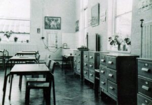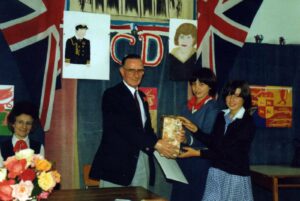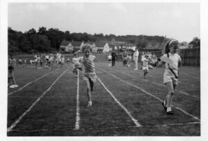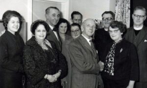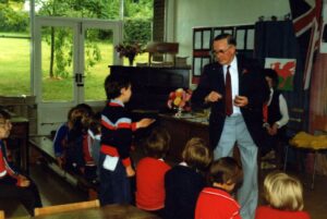 Mrs. Friend's retirement, 1963. Back row: Adrian Barton, Martin Johnson?, Roy Holton, Simon Barton, Ivor Johnson, Jeffrey Clayton, Pat Gould, Jeannette Clack, ?, Elizabeth Roberts, ?. Front row: David Allcott, Stephen Worsley, Diana Salmons, Malcolm Earle, ?, ?, ?, Guy Chamberlain, ?, ? Humphries, Miles Chamberlain, Peter Wilkes, Julia Clack.